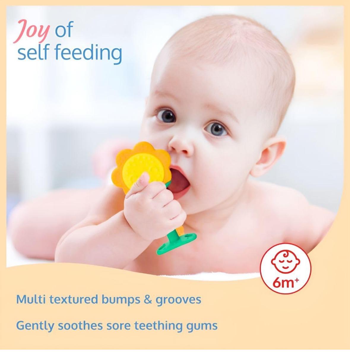 The cheerful sunflower shape encourages hand-eye coordination and sensory stimulation, helping babies develop fine motor skills while keeping them engaged. Soft, flexible, and easy to grasp, it provides gentle relief for teething discomfort and is lightweight for home or travel use. Safe, fun, and practical, it is an essential teething accessory for every baby.